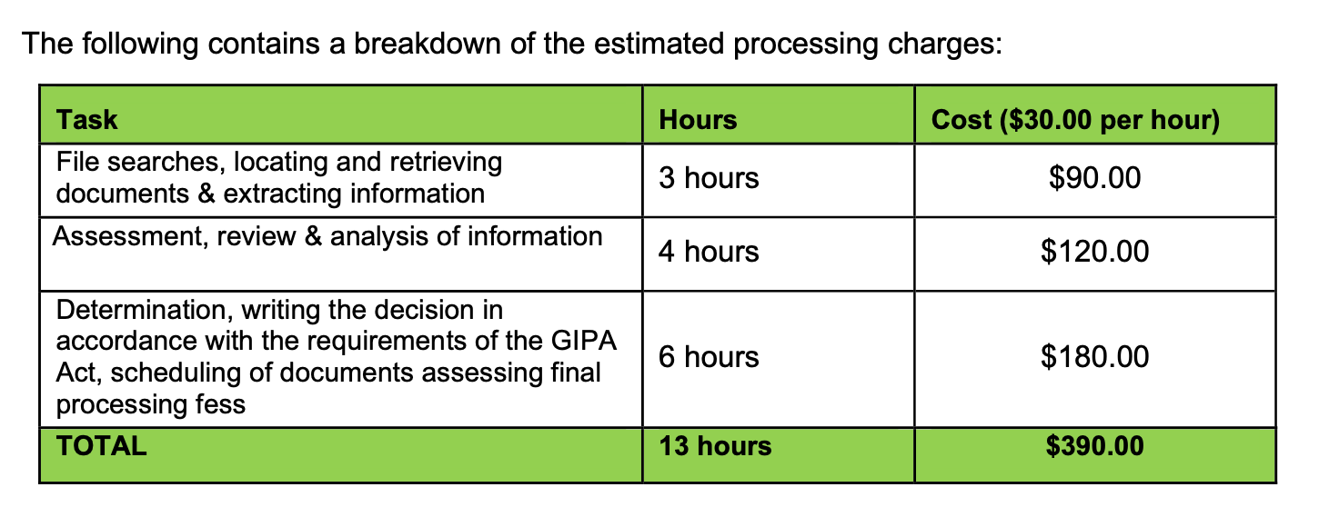 I also submitted a request for Covid data differentiating between ‘with’ Covid cases and ‘of’ Covid cases. The GIPA office responded with an estimate of $390 to process my request.