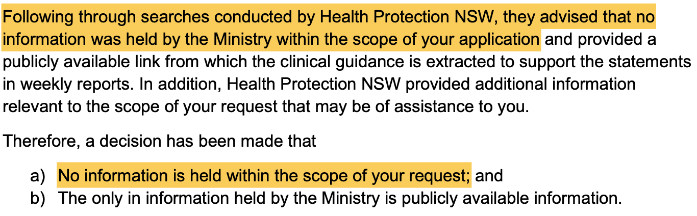 “Following through searches conducted by Health Protection NSW, they advised that no information was held by the Ministry within the scope of your application…”