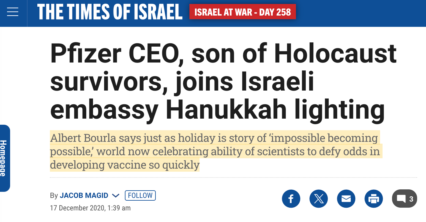 Not Bourla though. Since the start of the pandemic, the Pfizer CEO, who is the son of Greek Jewish Holocaust survivors, has frequently drawn on the memory of the Holocaust in his public commentary on medicine, Covid and vaccines, and anti-semitism. (Interestingly, a Google search yields no hits on Bourla making public statements about his Holocaust heritage prior to the pandemic and Pfizer’s vaccine development.)