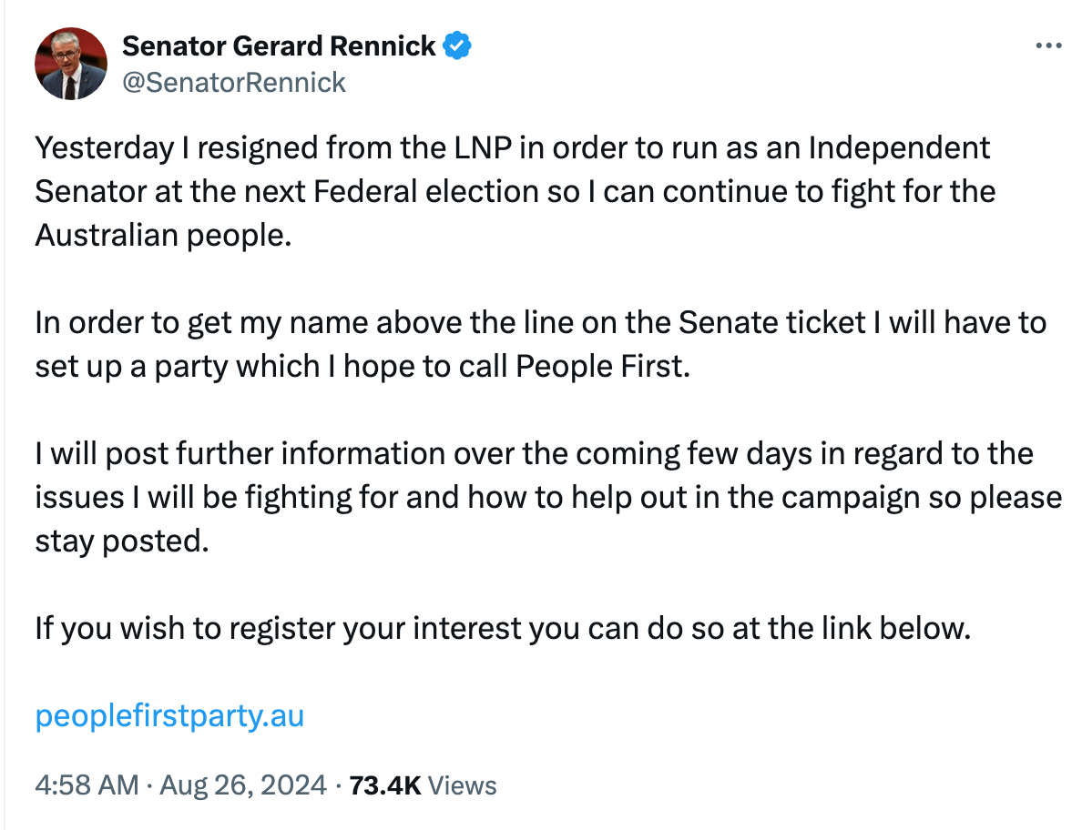 After being relentlessly maligned in the media and in the Australian Parliament for his heterodox views on matters from Covid vaccine injury, pandemic management and climate policy, Senator Rennick announced yesterday that he has resigned from the Liberal National Party and will run as an independent at the next federal election under the banner of the People First Party. Last year, Senator Rennick lost his spot on the LNP ticket for the next election.