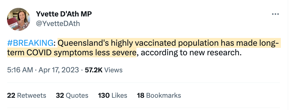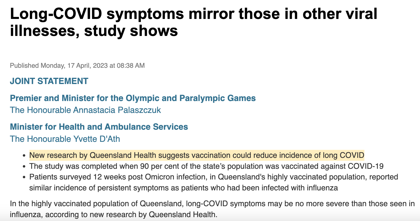 Premier Annastacia Palaszczuk on the other hand, makes a giant leap from ‘roughly equal prevalence of long flu and long Covid’ to ‘it’s all because of the vaccines, so be thankful I forced you all to get the shots’ on the basis that,