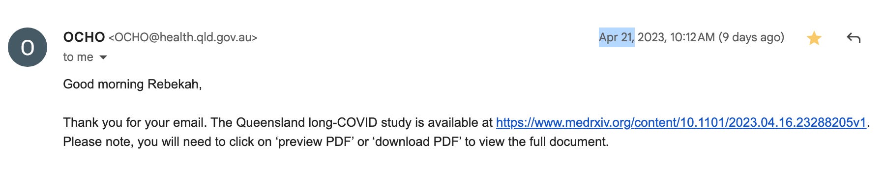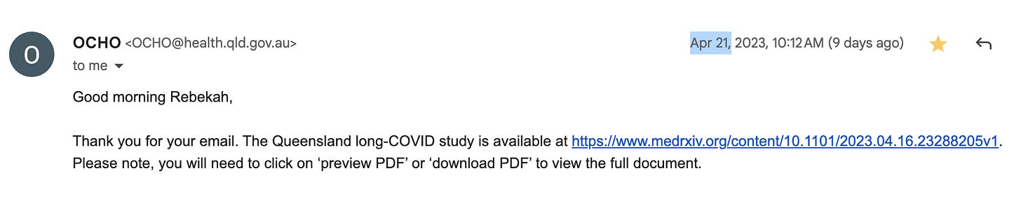 In the case of this QLD study, it had actually been available on the preprint server since Monday 17 April, the day that this propaganda cycle began, but it took five days of pestering QLD Gov to receive the link.