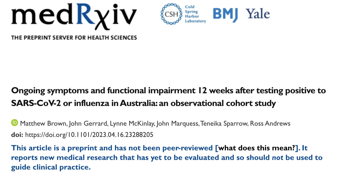 The study itself has some problems, which Andrew Madry from Datawise has unpacked, linked at the end of this post. Researchers measured the prevalence of long symptoms (12 weeks) in Queenslanders who had tested positive for Covid or influenza during the winter of 2022. What they found was that long Covid and long flu were about on par with each other, in both prevalence and severity.