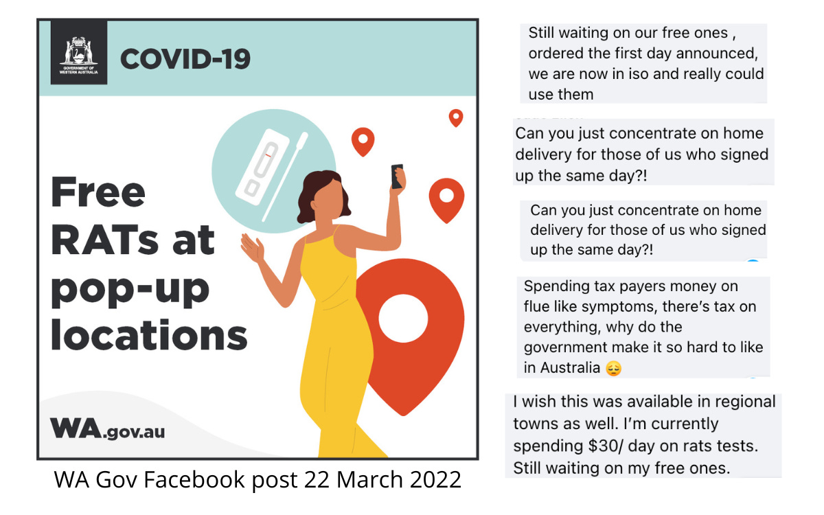 By the end of February 2022, WA Gov was advertising free RATs for every household. Many people, myself included, had already spent hundreds of dollars buying RATs online as soon as they could legally be shipped into the state. The free RATs were issued throughout March and April, a full 4-8 weeks after the WA border opened on 05 February 2022, and far too late in the game to be used in the way recommended by Mina, which required that RATs be used at first detection of Covid in the community, not several months into the spread. Comments on the WA Gov Facebook page indicated how their handling of RATs was going down in the community: