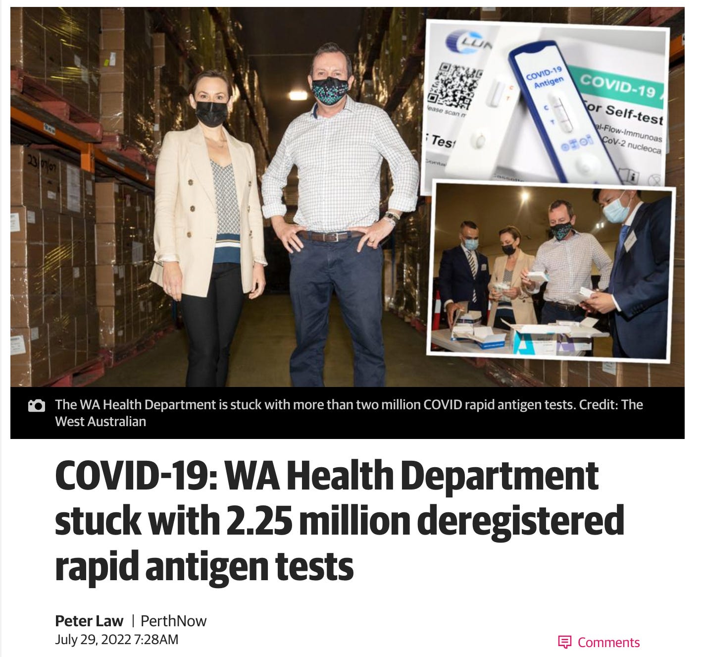 By July 2022, just last week, WA Health had to admit to the wastage of 2.25 million non-compliant RATs. Though compliant at the time of purchase, the RATs have now been removed from the list of TGA approved tests and are no longer thought by the regulator to be effective. WA Gov spent half a billion dollars on 110 million RATs. Assuming price parity across all brands purchased, these 2.25 million RATs cost tax payers just over one million dollars.