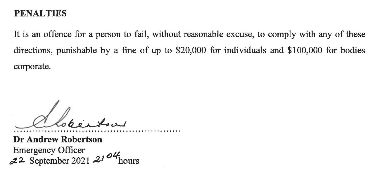 Chief Health Officer Dr Andrew Robertson signed the order into effect on 22 September 2021 to prevent West Australians from self-diagnosing Covid infection. At the time, the only way legal way to test for Covid was with a PCR administered at a government-approved site.