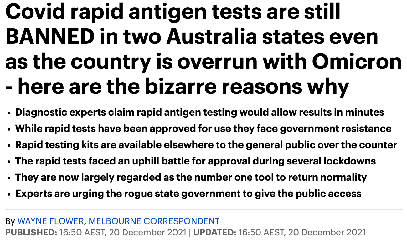 “Dinosaur health bureaucrats in two Australian states are continuing to add to Christmas Covid-despair with bans on rapid antigen testing kits for the general public.”