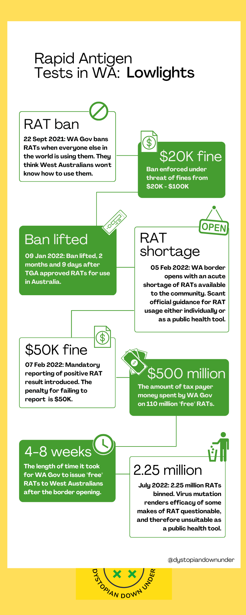 At this point in the timeline, it seems as though the promise of rapid antigen tests has turned out to be a net loss - for the taxpayer purse, for the reputation of WA Gov, and for controlling spread early in the piece, when RATs would have been useful.