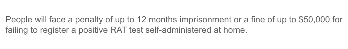 The WA border finally opened on 05 Feb 2022, and in one of its hardest pivots of the pandemic, WA Gov went from threatening $20,000 fines for having a RAT to $50, 000 fines for failing to register a positive RAT result. The mandatory registration requirement for RATs was announced on 07 February 2022 with the below caveat: