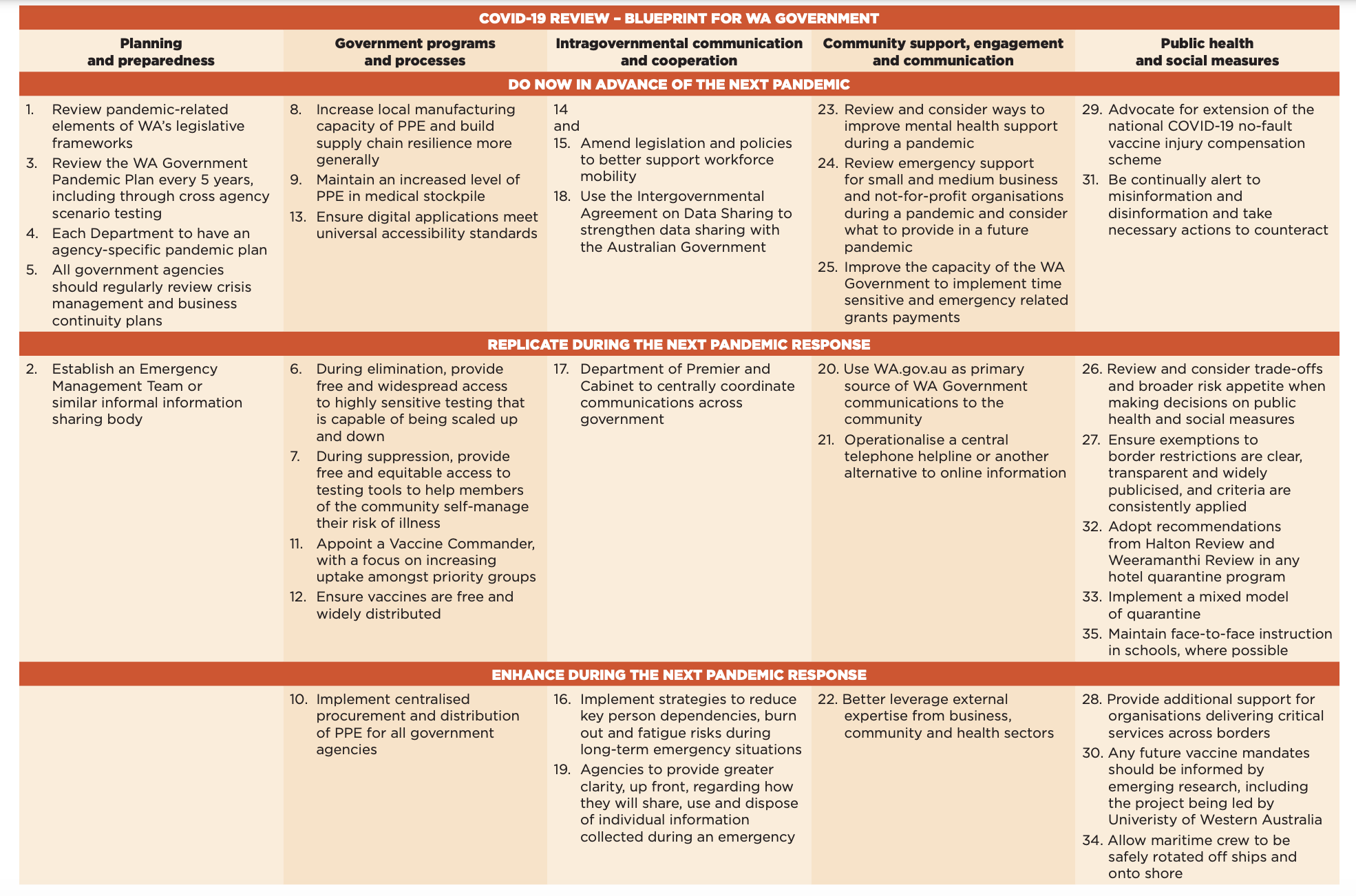 The most encouraging recommendation is, "Review and consider trade-offs and broader risk appetite when making decisions on public health and social measures" (#26).