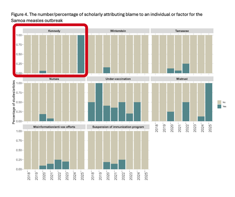 “Robert F Kennedy was seldom held responsible for the Samoa measles outbreak between 2019 and 2023 (18.5%), but often held responsible between 2024-present (100%). This pattern of attribution raises the question of whether Mr. Kennedy was actually thought responsible contemporaneously or rather whether he is being scapegoated on the eve of his confirmation.”