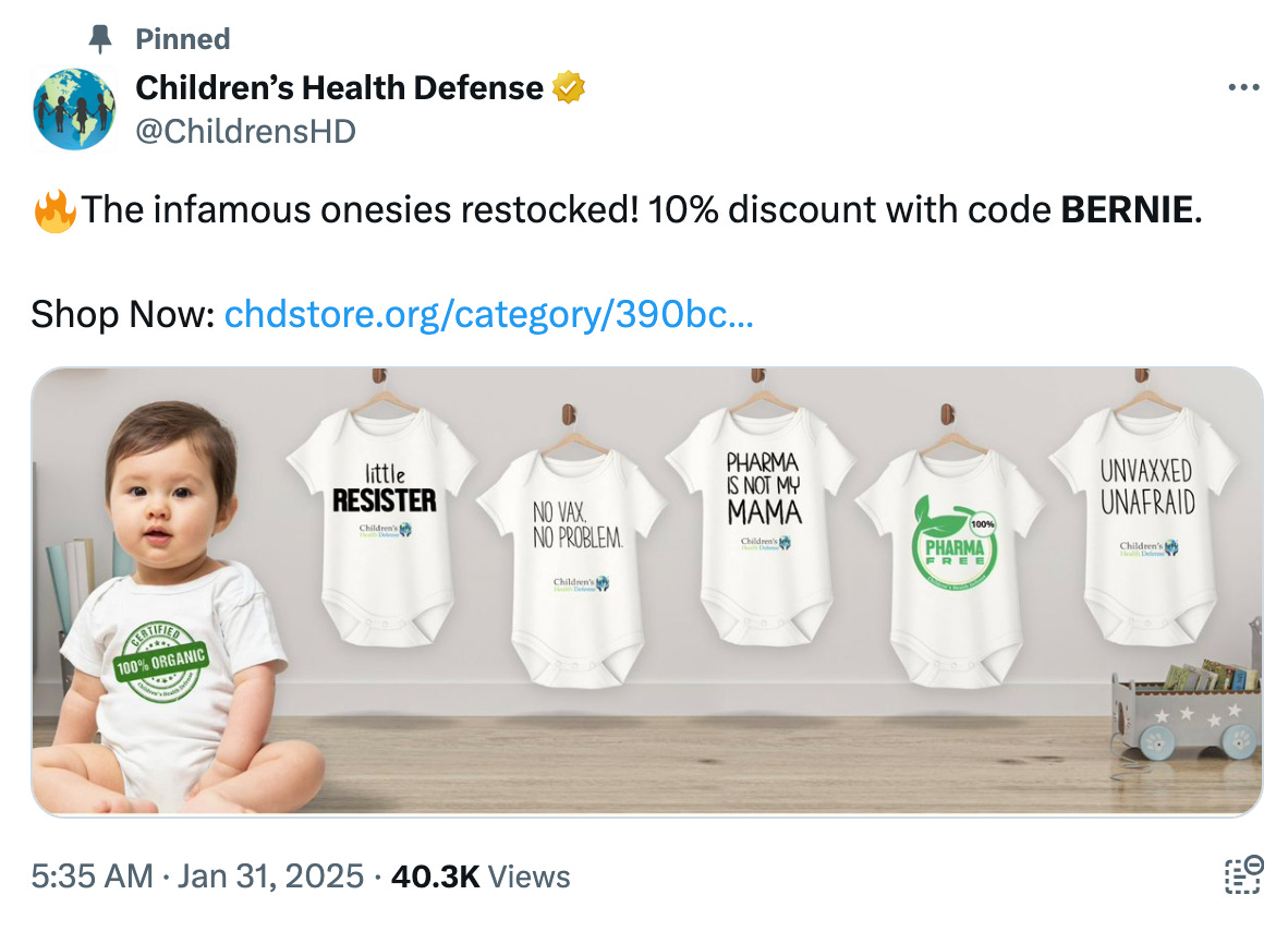 The onesies, sold by Childrens Health Defense (CHD), say ‘Unvaxxed Unafraid’ and ‘No Vax No Problem.’ Kennedy founded CHD, but stepped down as Chairman at the beginning of his Presidential campaign and formally resigned in December 2024. Sen Sanders was very perturbed that Kennedy would not commit to having CHD remove the onesies from their online shop, despite Kennedy no longer being associated with the organisation.