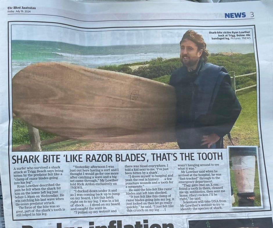 My fiancé Ryan became a local celebrity last week after he was bitten on the leg by a shark while going for a sunset surf at Trigg Beach on the Perth coast. The odds are 1 in 2.7 million if you live in Australia, apparently.