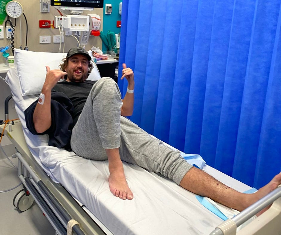 Naturally, I had a minor freakout, but Ryan insisted he was ok and drove himself to hospital. When I met him there he was in good spirits, having been fast-tracked into the emergency triage area. After unsuccessfully fishing around in his leg for what appeared on the X-ray to be a shark tooth, the doctors patched Ryan up and sent him home with a prescription for antibiotics.