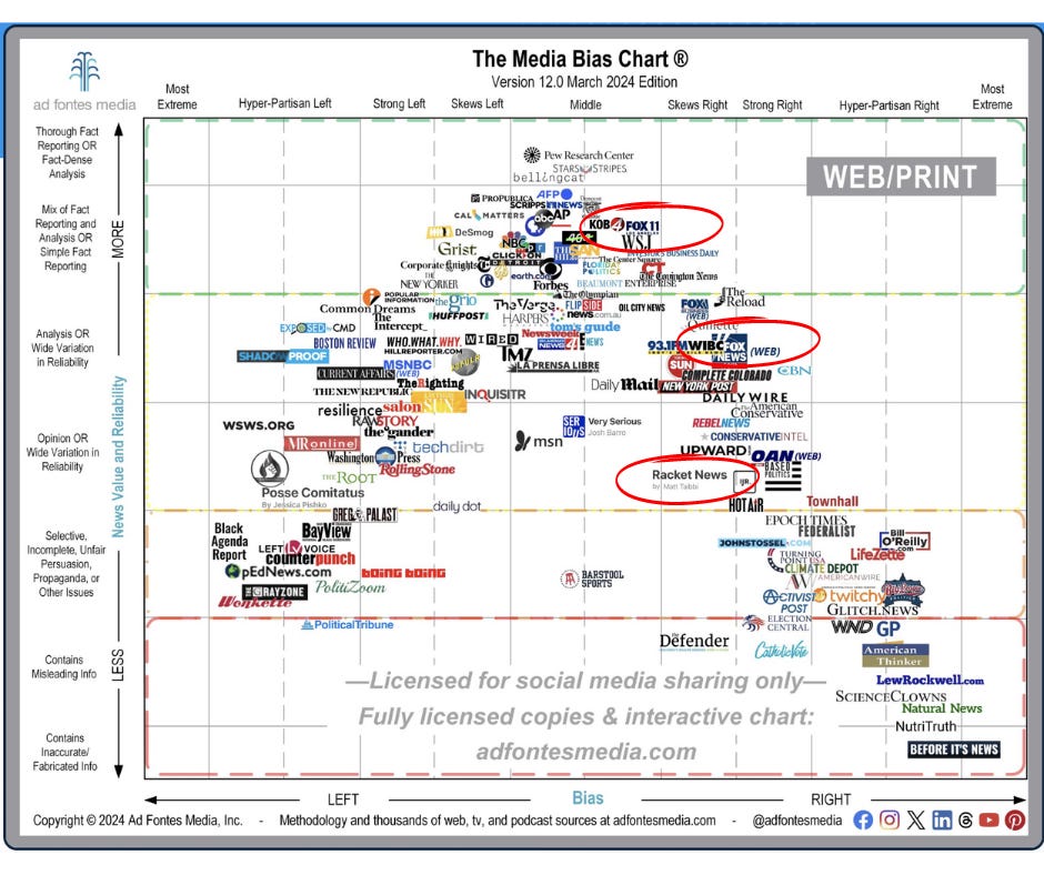 Proof that political descriptors ‘right’ and ‘right wing’ have lost all meaning: Ad Fontes Media’s new Media Bias Chart places Twitter Files journalist Matt Taibbi’s Racket News on par with Fox. ‘Skews right.’