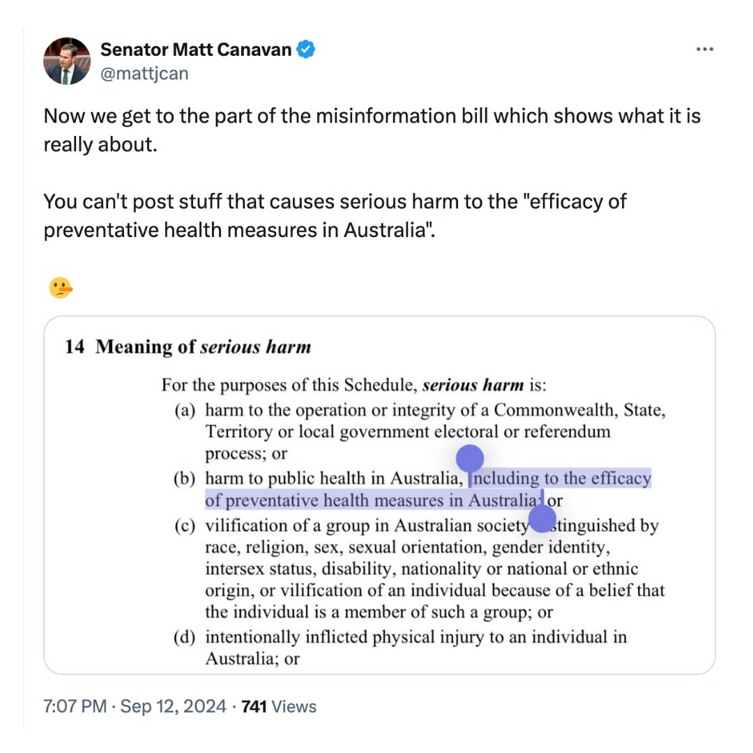 I was feeling happier, right up until I read about the Corporate Government getting a free run for disinformation on vaccines.... But wait.... AGAIN the wording is really bad... "harm [..] to the efficacy of preventative health measures" ... You can't harm EFFICACY with words - public health measures either have efficacy or they don't. Who is writing this stuff??