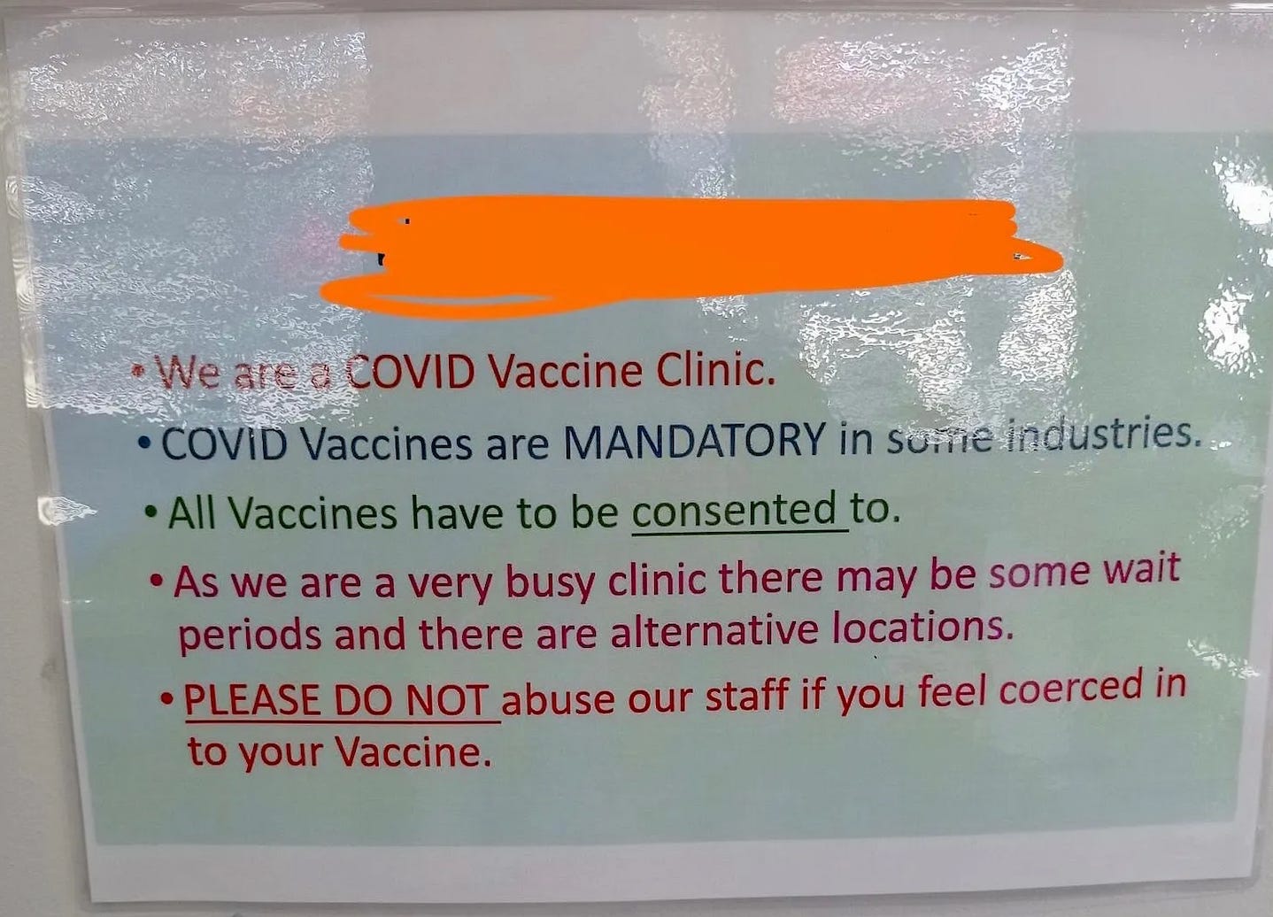 I wonder if they read their own sign, observing that vaccines are mandatory and have to be consented to? The semantics of this is horrific ... observing that it is mandatory to consent. Huh??