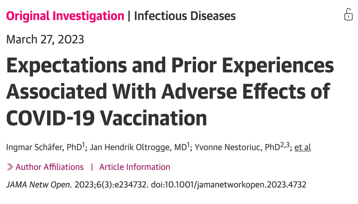 Back to the study, which was a smallish prospective cohort study of 1,678 Germans, titled ‘Expectations and Prior Experiences Associated With Adverse Effects of COVID-19 Vaccination.’ The subjects were evaluated prior and post their second Covid vaccination to determine if psychosocial context factors were associated with their experience of vaccine side effects.