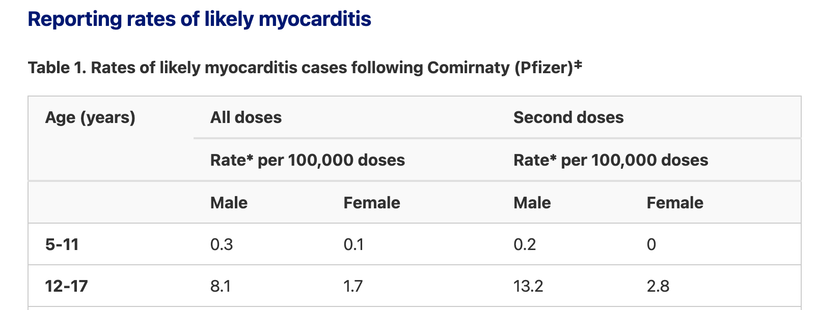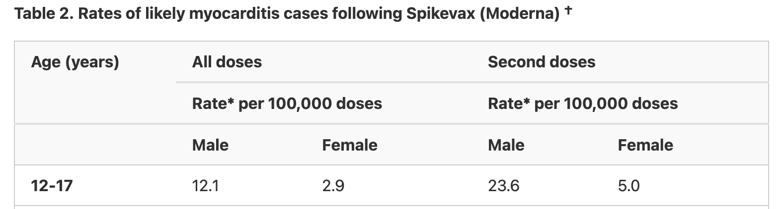 West Australian 2021 Covid vaccine safety data, showing rates of 9.2 cases of myocarditis per 100,00 Moderna shots for kids 12-17 years old: West Australian government finally releases 2021 vaccine safety data: vaccines have been pulled from the market for far less than this