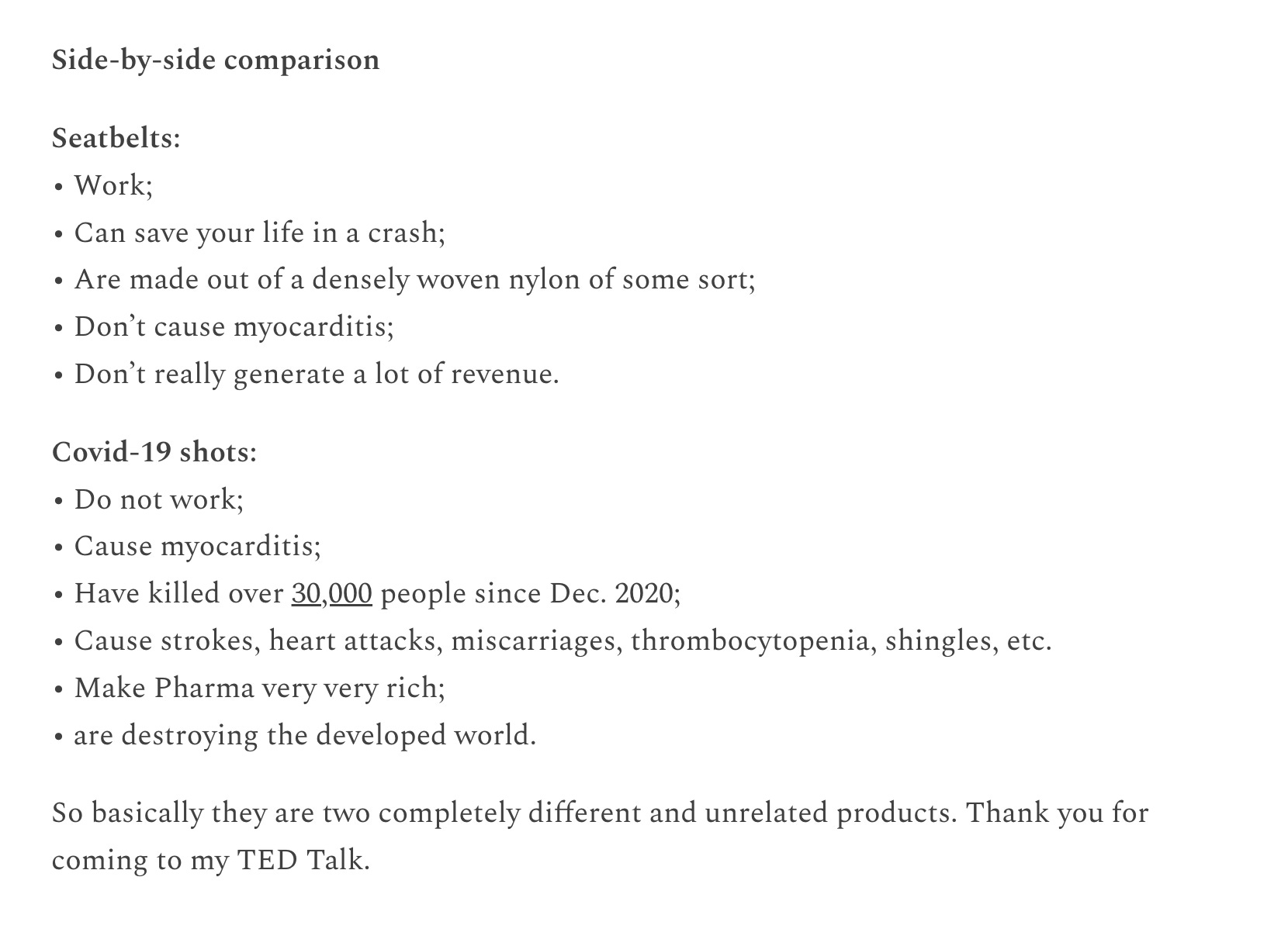 Comparing seatbelt laws to (Covid) vaccine mandates is silly. Stop doing it. If you hear someone doing it, ask them to stop. Let’s be smarter, together.