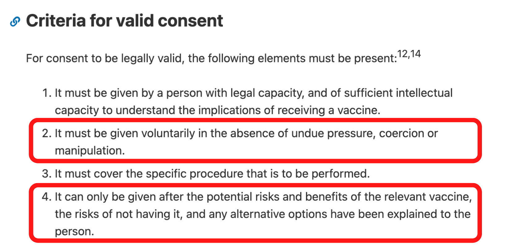 Note that points 2 and 4 have not been met in most cases of Covid vaccination in Australia. Coercive work and travel mandates (among other restrictions) were in place for the primary doses and in some states, for boosters as well (for example, one could leave WA in January 2022 having received only 2 doses, but could not re-enter the state until receiving the booster). Further, I guarantee that most Australians were not informed at the time of their coerced vaccination that the spike stays in their body for… actually we don’t know how long. Or that their vaccination may cause immune imprinting. Or that it may cause abnormalities in their blood. Or that the side effects in certain age cohorts are a greater risk than is the virus itself.