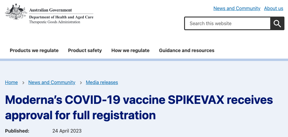 Today, the Therapeutic Goods Administration (TGA) announced that it has granted approval for full registration of Moderna’s Covid vaccine, SPIKEVAX. This is the first Covid vaccine in Australia to receive full registration - the others remain provisionally approved.1