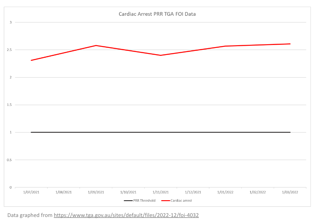 Prof John Skerritt says that cardiac arrest is not a safety signal for Covid vaccines. Here is the TGA’s own Proportional Reporting Ratio data on cardiac arrest, graphed (from FOI 4032). It shows a PRR of >2.