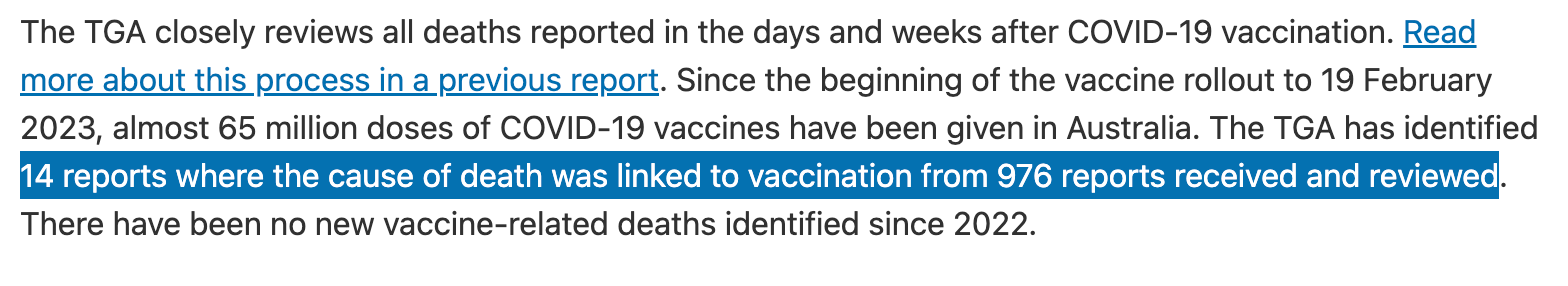 If some of the causality assessments remain incomplete, that would render meaningless this line from the TGA’s regularly safety reporting, which states that there are only, “14 reports where the cause of death was linked to vaccination from 976 reports received and reviewed.” If ‘reviewed’ does not equal ‘a completed assessment for causality such that the probability of causality is established’, then the obvious question is - how many reported deaths have been assessed in full, and how many reports are outstanding? I am aware of at least two people having asked this question via FOI, only to have the request denied.
