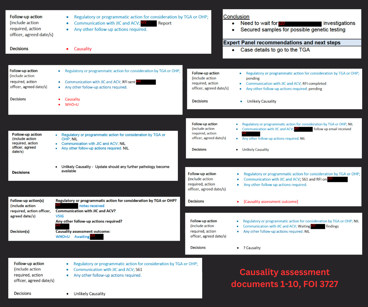 The TGA has responded to my request for comment on causality assessment documents from FOI 3727 for ten reported deaths, of which five appear to have been causally linked to Covid vaccination by the TGA.