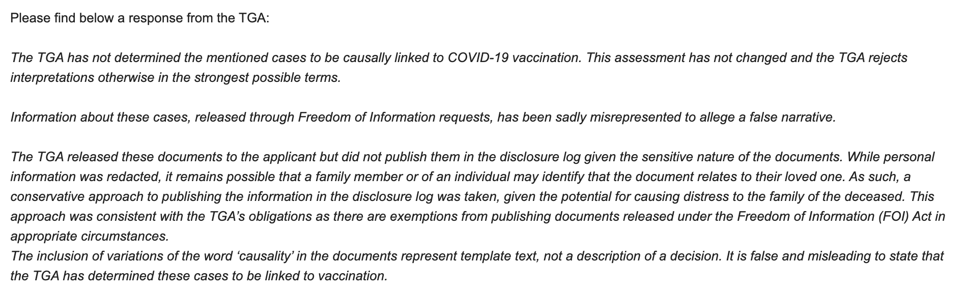 “The TGA has not determined the mentioned cases to be causally linked to COVID-19 vaccination.” In my experience, the TGA’s communications are laden with obfuscation and omissions. Does this phrase mean that: