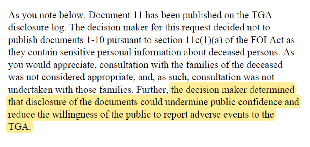 The TGA claims compassion for grieving families is the only reason for hiding these documents from public view. Recall that on 24 August 2022, the TGA wrote to Dr Melissa McCann that the documents had been withheld from the public log because, “disclosure of the documents could undermine public confidence and reduce the willingness of the public to report adverse events to the TGA.” What are we to make of this omission in the TGA’s official response to me on this matter?