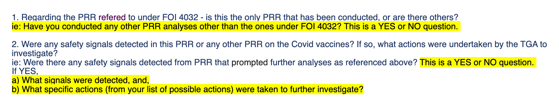I have asked the TGA on three occasions to determine if any safety signals were detected from the PRR reports which contained the data graphed above. I have received wordy replies assuring me that safety monitoring is carried out regularly, and explanations that PRR is just one form of analysis and should not be taken to mean anything on its own. What I have not received is a straight answer. I have now taken to using yellow highlighter and asking for a YES or NO answer. The below is an email request from 11 days ago which remains unanswered.