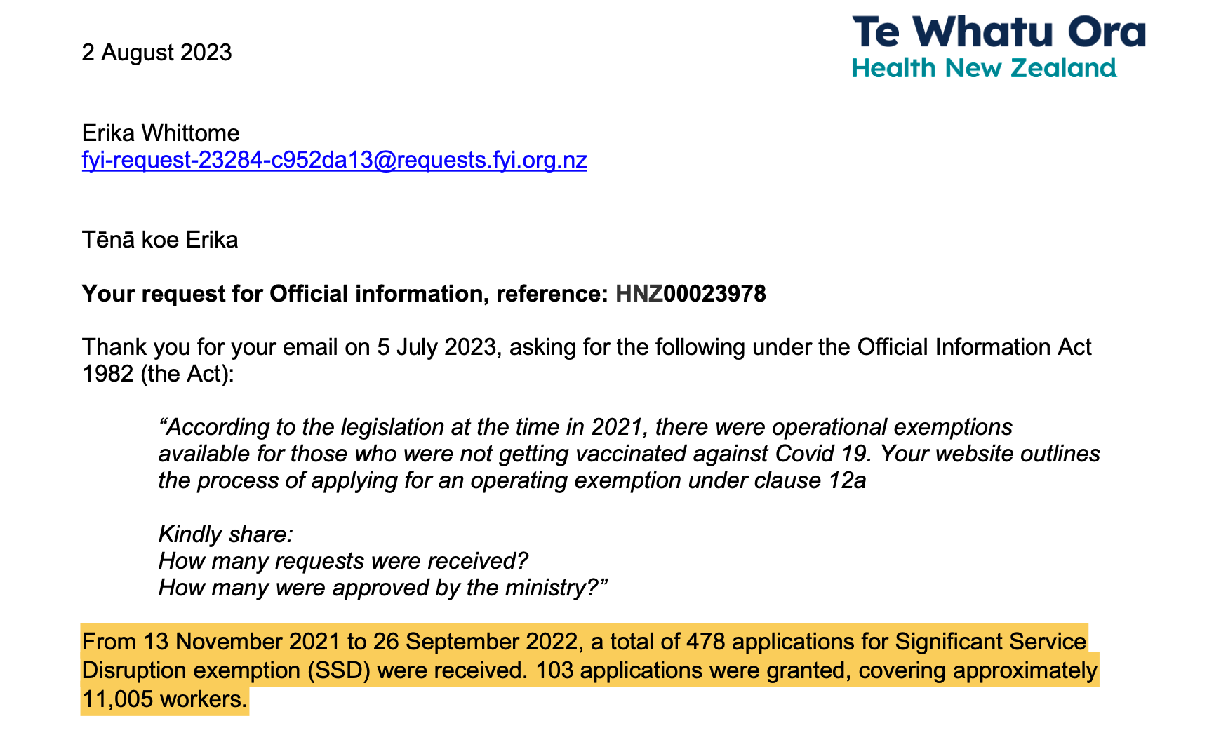 The news comes from an Official Information Act (OIA) request asking how many exemptions had been granted within the national public health service, Te Whatu Ora.