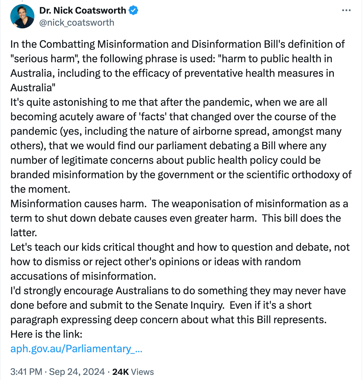 Dr Coatsworth raises two important points not addressed anywhere in the government’s misinformation bill or supporting documentation.