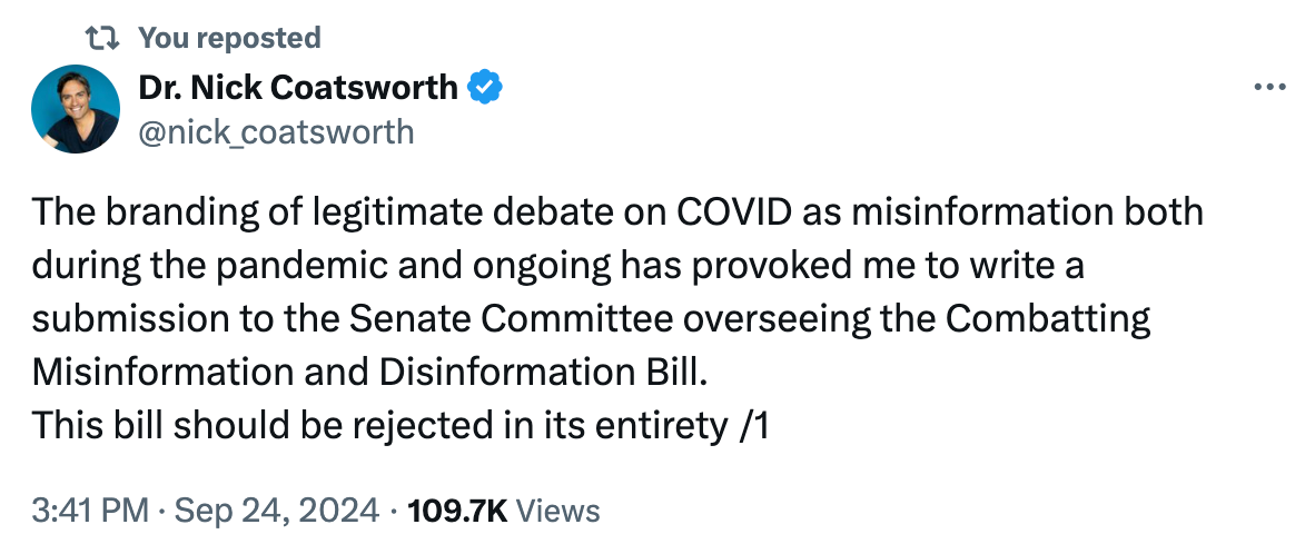 “The branding of legitimate debate on COVID as misinformation both during the pandemic and ongoing has provoked me to write a submission to the Senate Committee overseeing the Combatting Misinformation and Disinformation Bill. This bill should be rejected in its entirety[.]