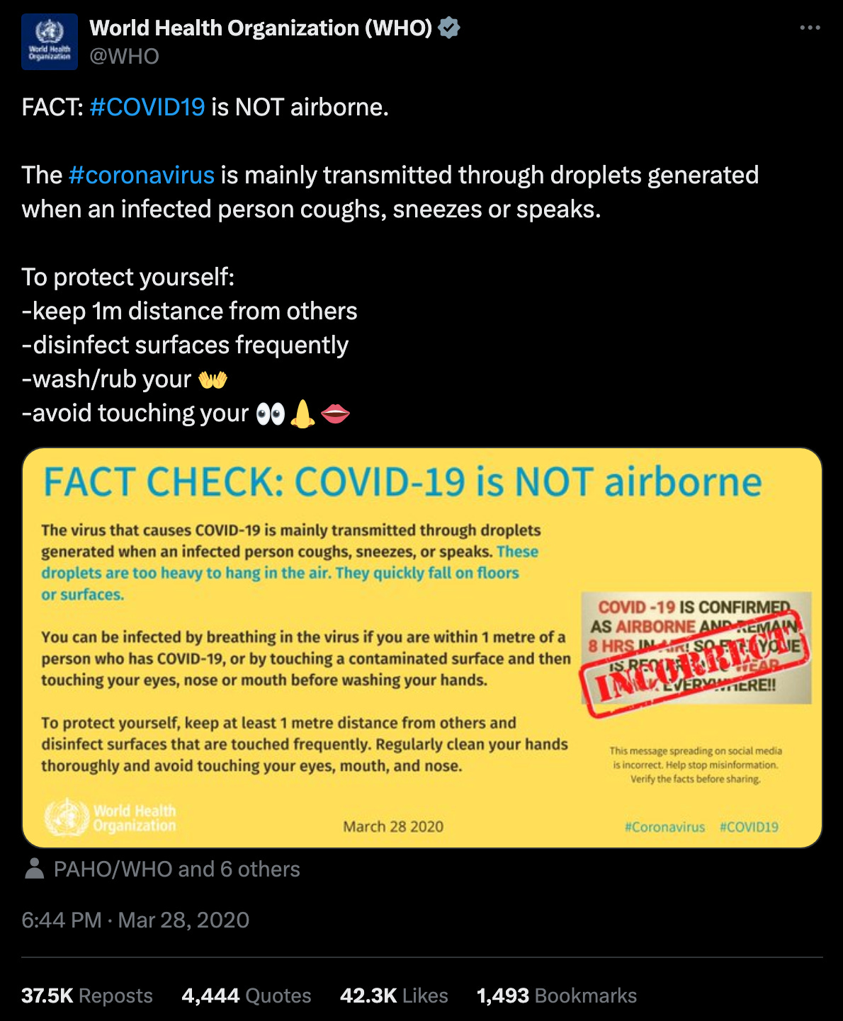 To take Dr Coatswoth’s example, the World Health Organisation (WHO) incorrectly tweeted in March 2020, “FACT: #COVID19 is NOT airborne,” and continued to downplay the role of airborne transmission throughout the first year of the pandemic, long after the evidence showed that the virus is indeed airborne.