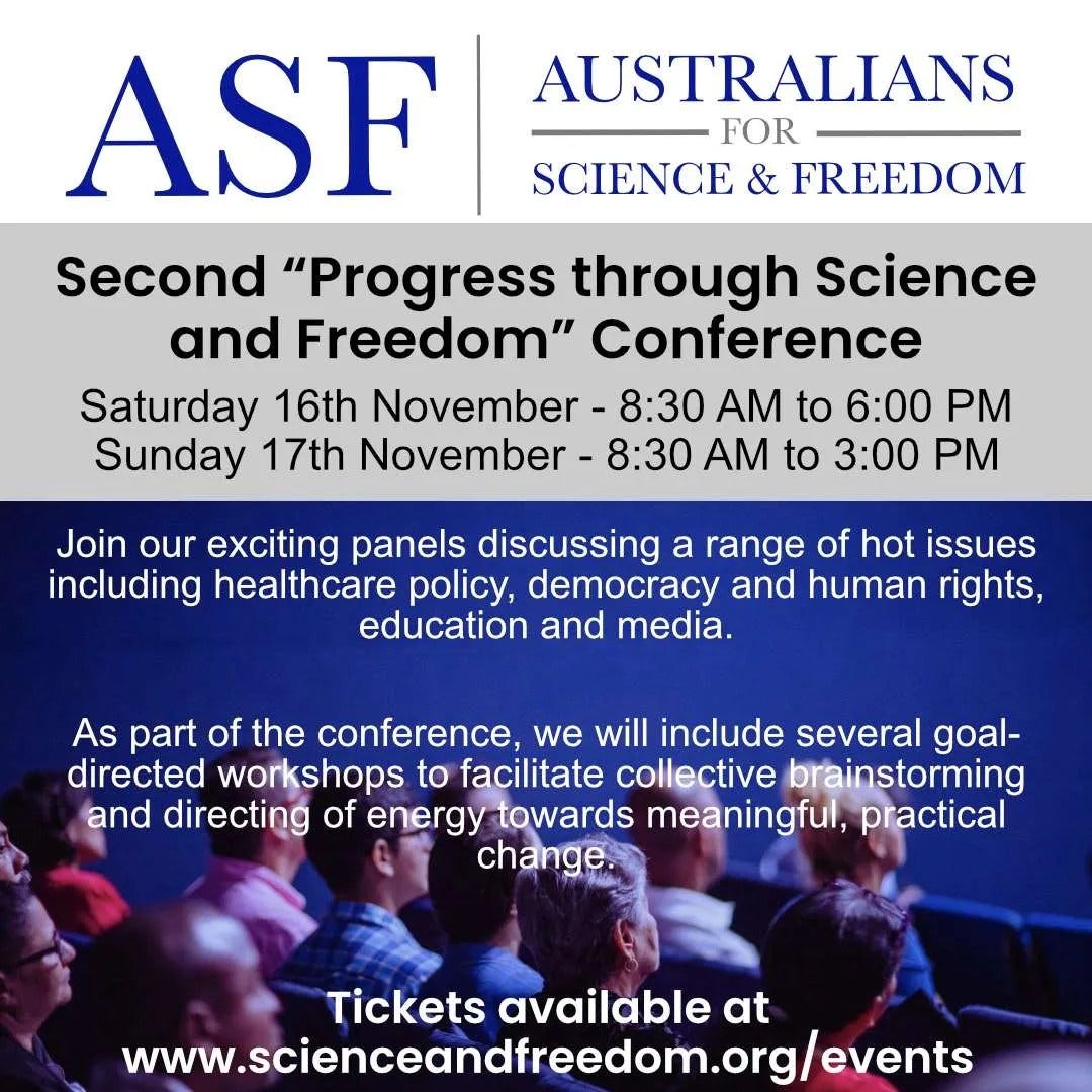 This conference hosted by Australians for Science and Freedom will feature a line-up of health professionals, scientists, economists, lawyers, journalists, educators and community leaders to discuss a range of topical issues including healthcare, education, the legal system, the media, and the role of grassroots organisations.
