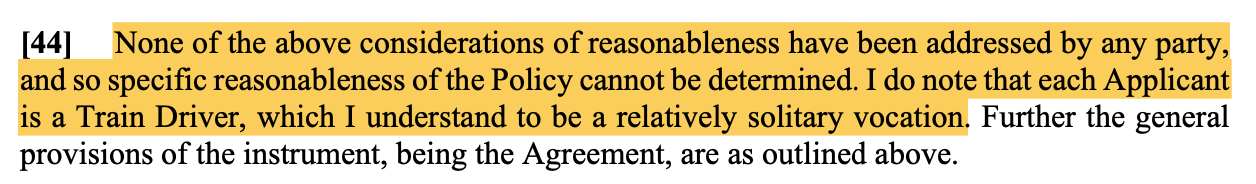 Sydney Trains’ vaccination requirement for the train drivers was deemed to be unreasonable: the decision notes that train driving is a relatively solitary activity.