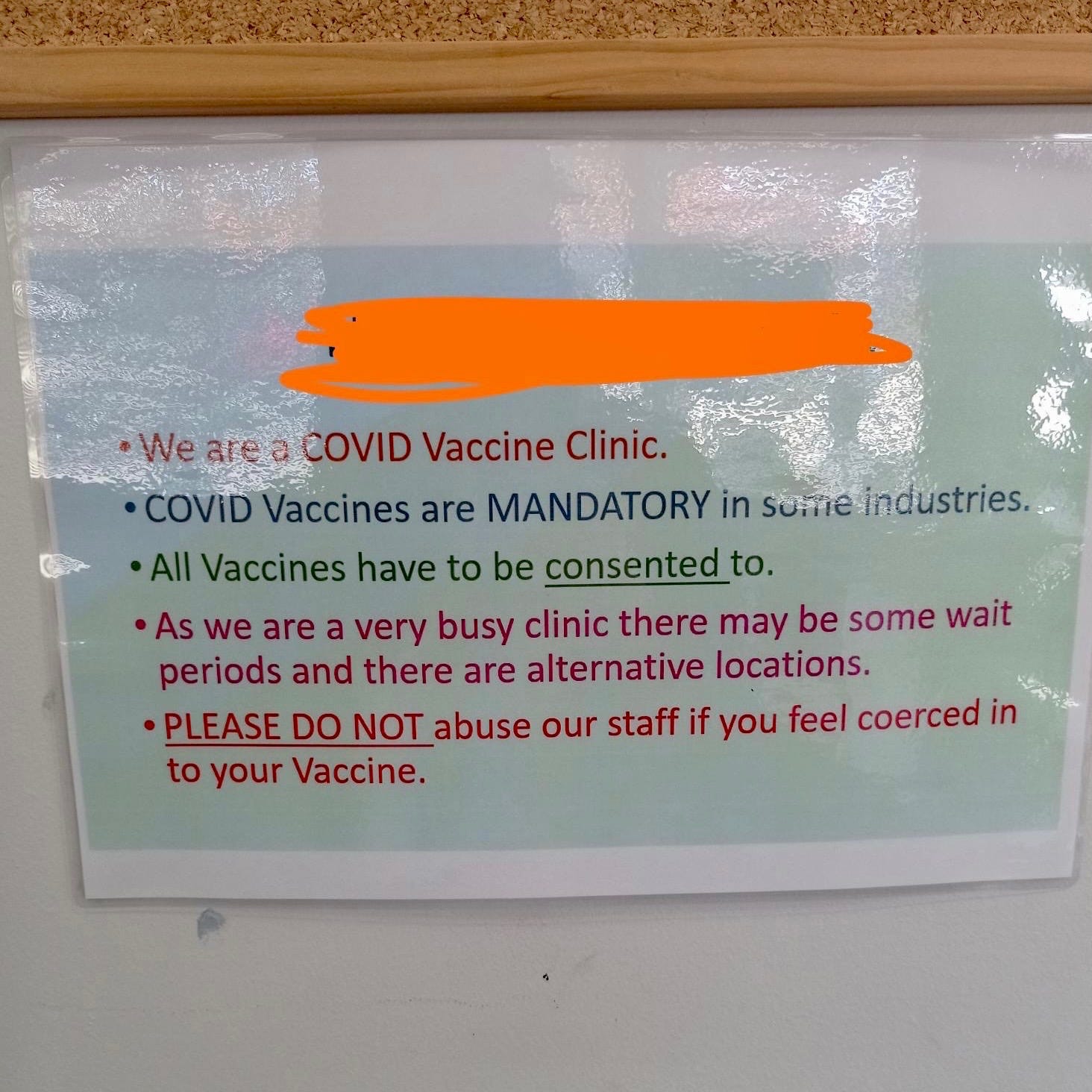 This paints a pretty different picture from Ben O’Shea’s characterisation of the double and triple jabbed workers as smugly expecting “gratitude” and “contrition” from the returning unjabbed. How many upset and aggravated people came through this clinic crying coercion before the staff made a sign specifically asking people who feel coerced not to get upset at the staff? It is a mistake to assume that everyone who got the vaccines did so willingly. It is a mistake to assume that those who were forced into unemployment are the only ones who are angry.