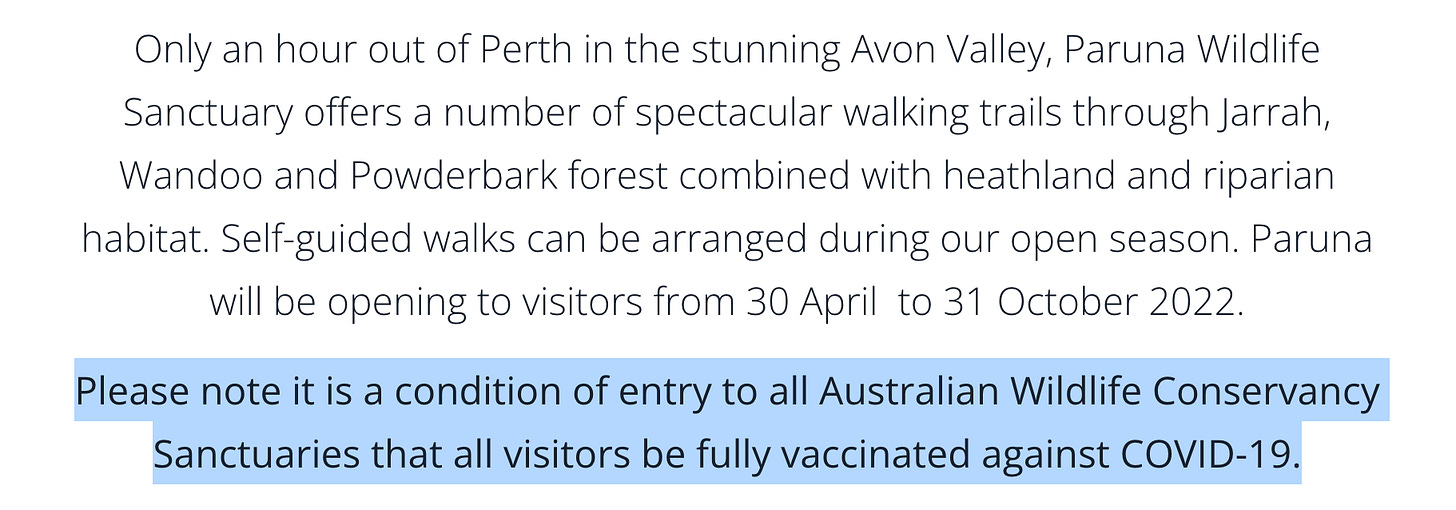 It starts from the government and mainstream media and works its way down. It’s understandable that wildlife park managers in the middle of nowhere think they need to prevent unvaccinated people from hiking in the bush in the fresh air.