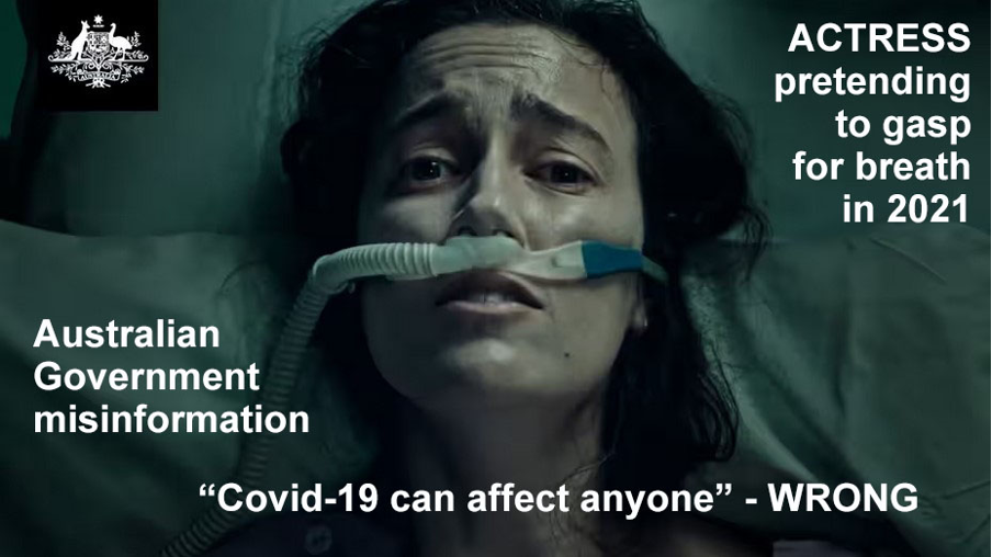 The young actress in the fear mongering ad below had almost zero risk of being hospitalised by Covid. The median age of Covid death in Australia was 85.5 years according to Australian Bureau of Statistics (ABS), older than normal life expectancy.