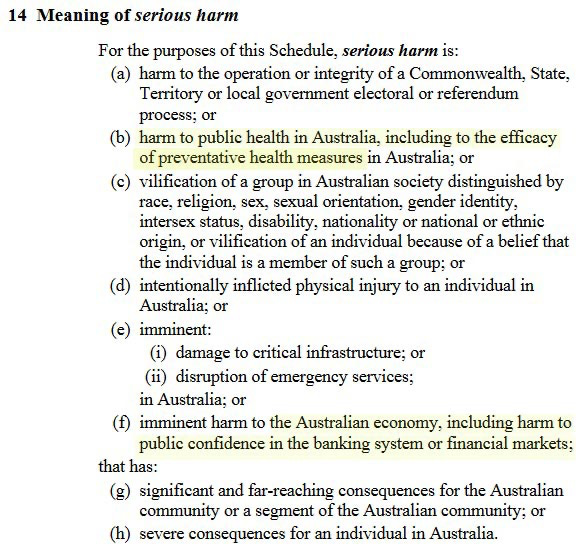 This Bill defines the “serious harm” of misinformation, at 14(b), as “harm to public health in Australia, including to the efficacy of preventative health measures”.