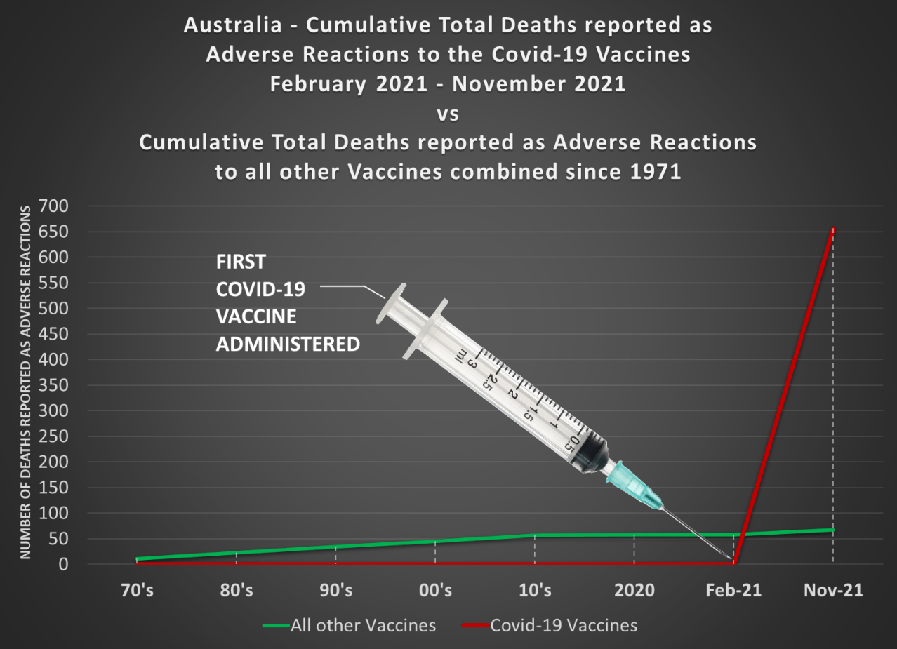 The Australian version doesn’t look good either. There have been 11 times as many deaths reported as adverse reactions to the Covid-19 vaccines over 8 short months than deaths reported as adverse reactions to every other available vaccine combined over a period of 50 years.