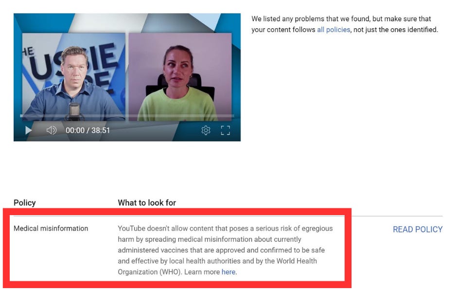 However, as previously discussed on this Substack, YouTube’s medical misinformation policy is not about ensuring the information on its platform is factual. It’s about maintaining the official line. As below,