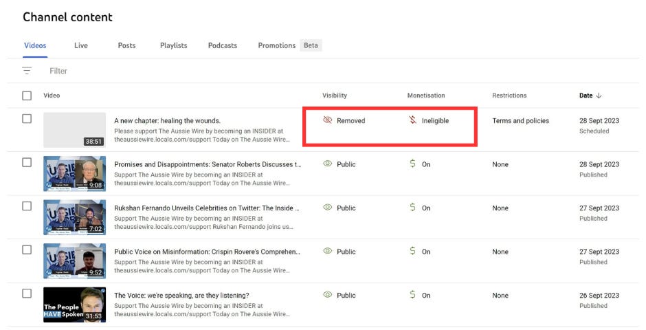 Yesterday, YouTube removed my new interview with Topher Field and issued a strike to The Aussie Wire account, citing a breach of its medical misinformation policy.